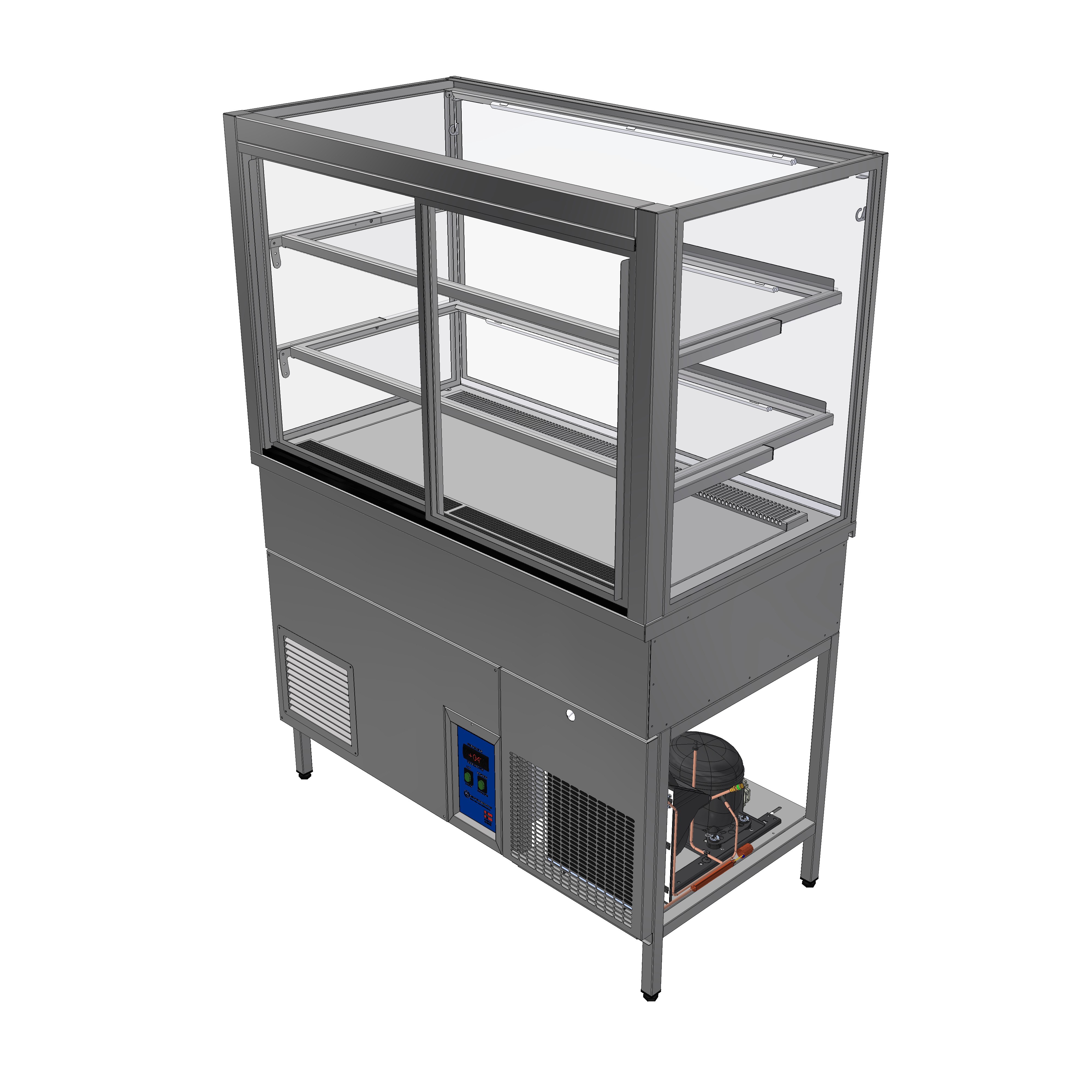 Utlufting fra kjølemaskin på betjeningsside, trenger ikke ventilasjonsrist i frontkledning.